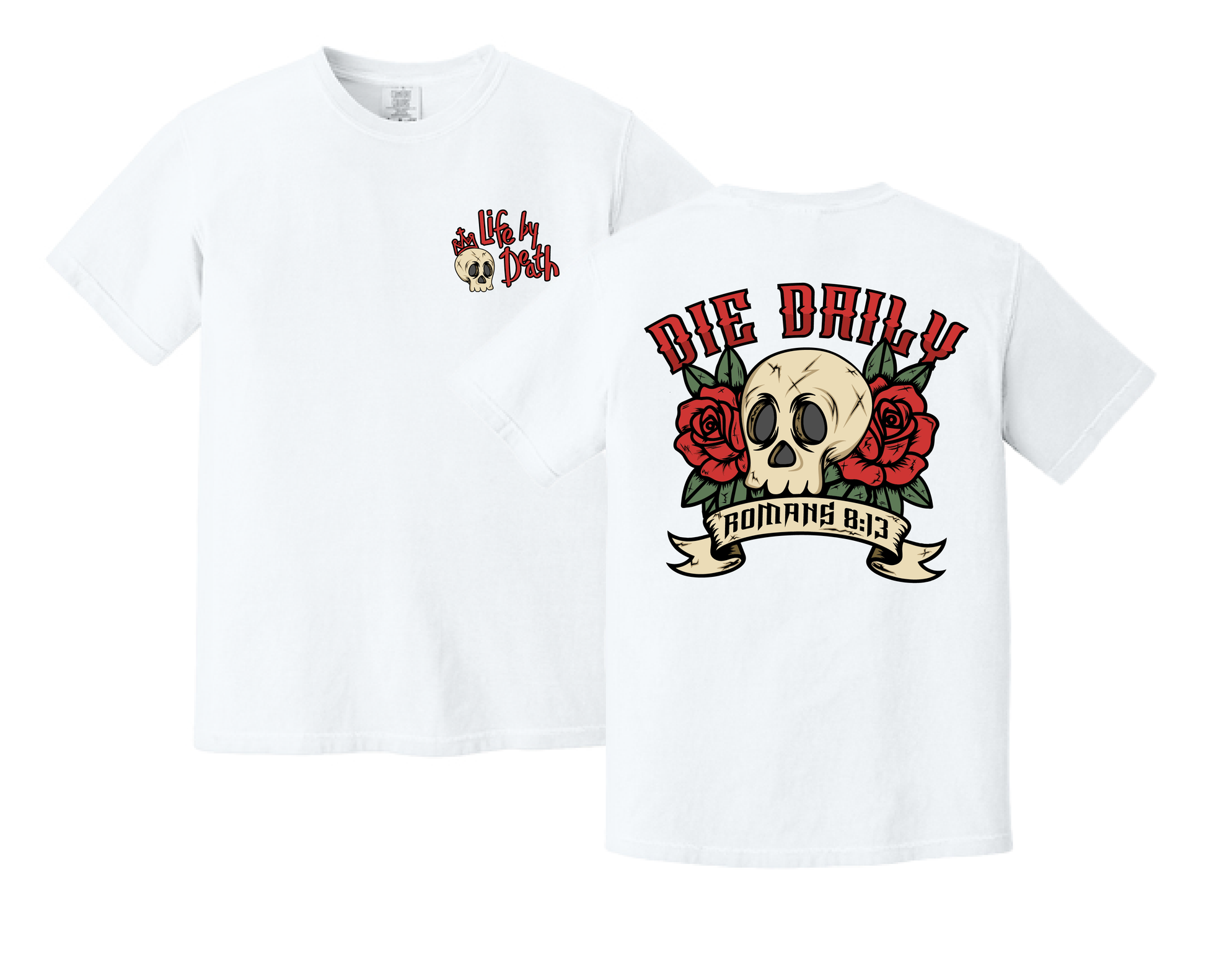 Die Daily is printed on a Comfort Colors shirt (black or white), available in sizes S to 4XL. It’s a visual confrontation: surrendering your agenda, your pride, your comforts — even your very reputation — so that Christ might live in you.
